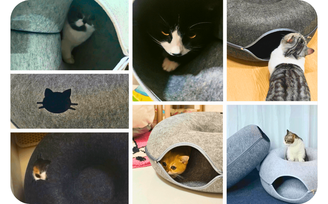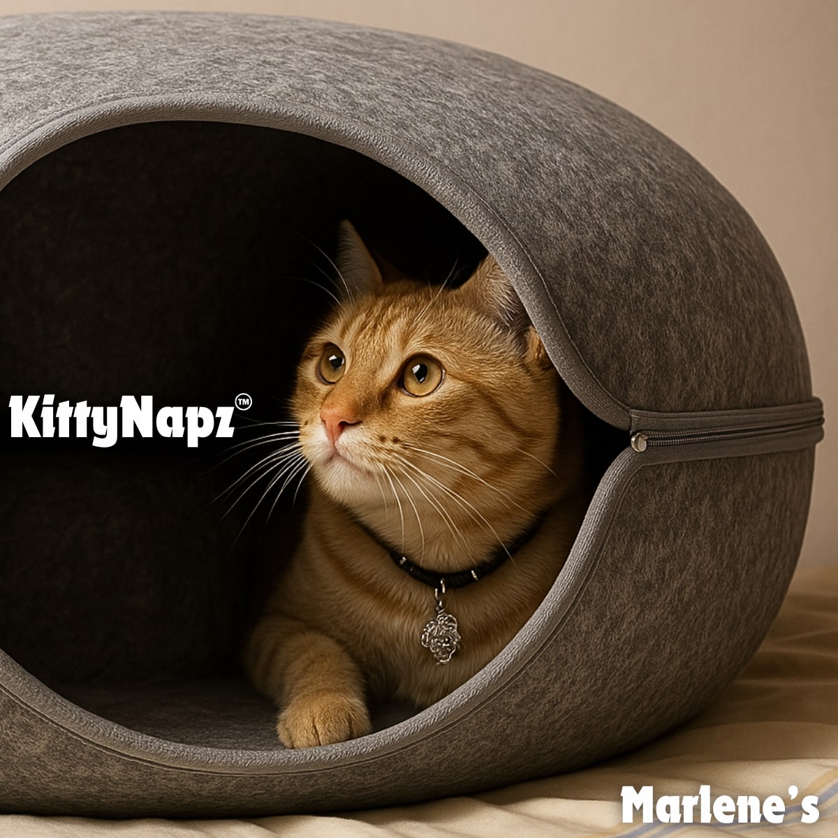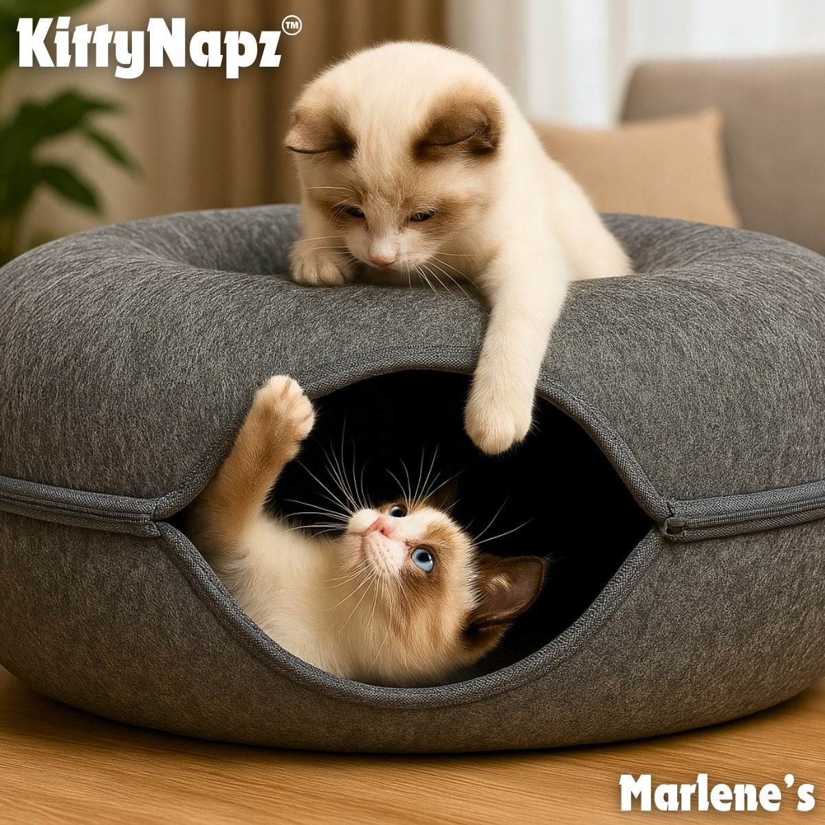 Kitty Napz combines the comfort of a plush bed with the fun of a play tunnel, creating a cozy hideaway that also satisfies your cat’s curiosity and need for activity. It’s the perfect multi-functional space for napping, lounging, and playing.